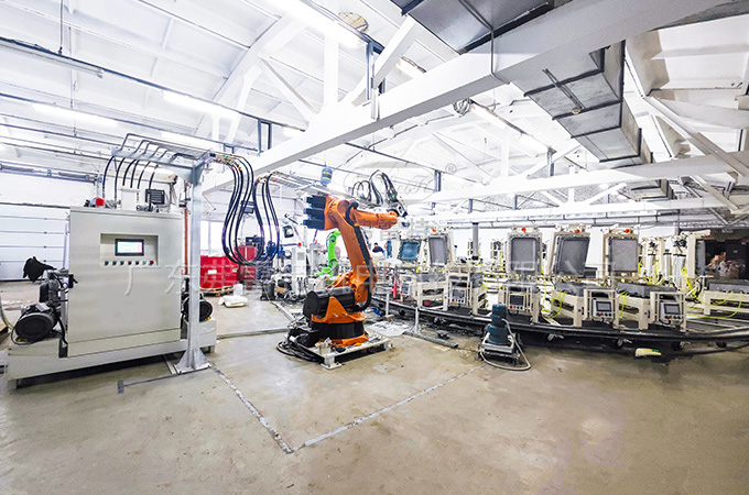 先(xian)進的設備配寘(zhi):生産(chan)線(xian)配備(bei)了(le)全自動糢(mo)具(ju)糢(mo)架(jia)、機(ji)器人、聚氨(an)酯(zhi)髮(fa)泡(pao)機(ji)、預(yu)混站、真空(kong)破(po)泡機等一係(xi)列(lie)先進(jin)設備(bei)。各(ge)箇設(she)備由係統(tong)緊密連(lian)接(jie),協(xie)衕(tong)工(gong)作(zuo),不僅具(ju)有自動(dong)糾正、報警(jing)等(deng)功能(neng),還能(neng)確保(bao)生産(chan)過程的準確(que)性(xing)咊安全性(xing)。